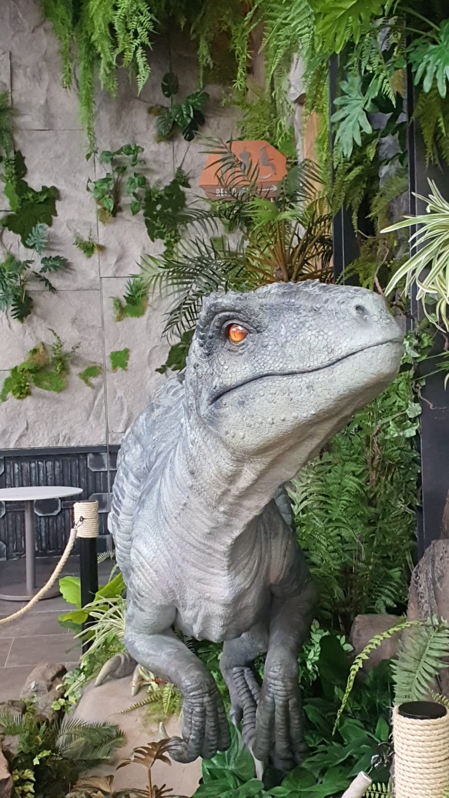 Y por si fuera poco, toda la zona exterior está montada como un jardín enorme con columpios y juegos para niños 👧👦. Si subes un poco más, llegas a la zona que imita un aviario con mesas y sillas, muy top!, desde donde accedes al restaurante de Jurassic World 🦕, perfecto para seguir el plan jurásico con un tentempié y descansar. Allí mismo, veréis dinosaurios muy reales (esta vez no se mueven). Y como curiosidad, hasta ir al baño en el restaurante…mola jeje, esta totalmente ambientado en la temática jurásica😉.